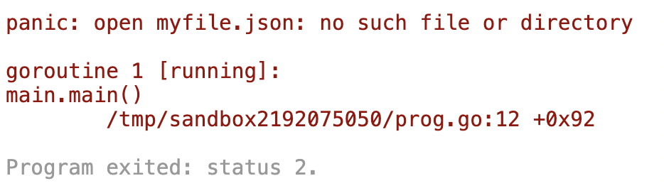 จากตัวอย่าง Code ด้านบนจะเห็นว่าเมื่ออ่านไฟล์ไม่ได้เราจะสั่งให้ Panic ส่งผลให้เกิด Runtime error ออกมาประมาณนี้ครับ